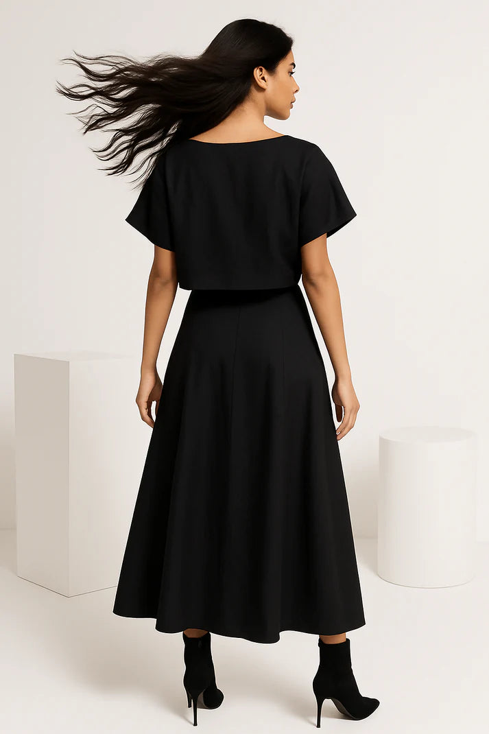 Step into effortless chic with this black denim stretch co-ord set. The crop top features a relaxed boat neck, elbow-length loose-fit sleeves, and wooden button accents on each shoulder for a subtle rustic charm. Paired with a high-waisted A-line midi skirt, detailed with bold front panel buttons and oversized square pockets, this set perfectly balances comfort with contemporary utility style.