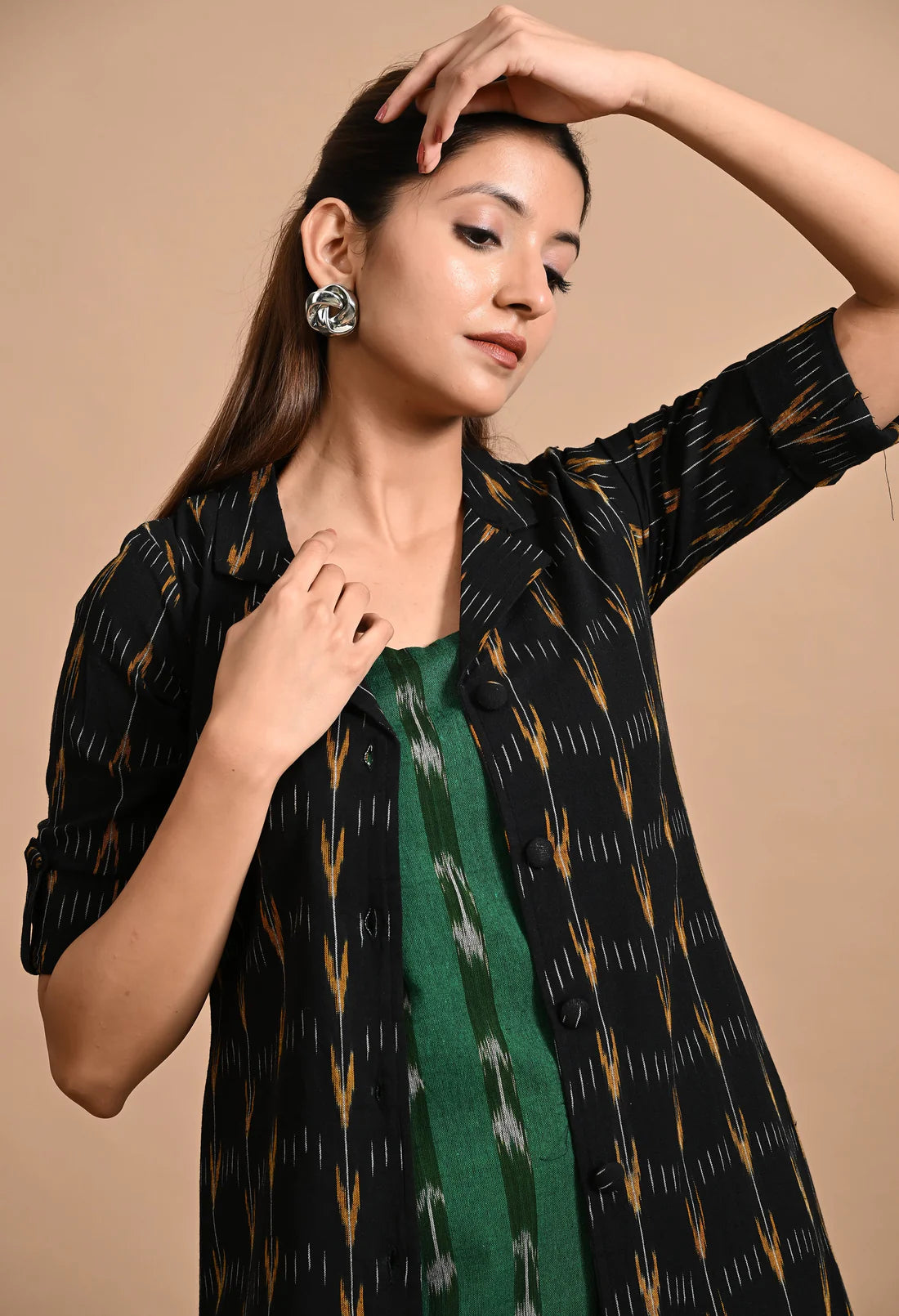 An Ikat shirt Jacket dress with inner is a stylish and versatile garment that combines the classic silhouette of a shirt dress which can be worn as a jacket with the inner , or on your favorite denims/ shorts . This dress style is perfect for those who appreciate the fusion of traditional craftsmanship with modern fashion. Pair it with sandals for a laid back look or with heels to elevate your Ensemble.