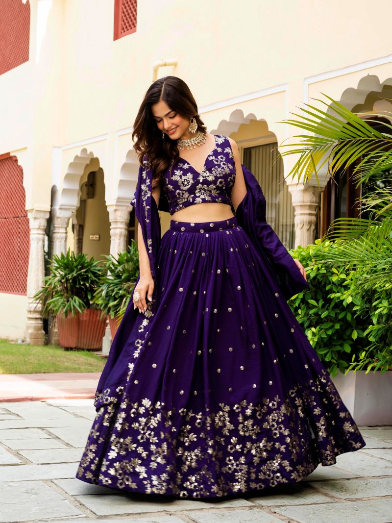 This elegant Purple Georgette Lehenga Choli is perfect for festive and party occasions. It features beautiful zari and sequence embroidery that adds a stylish and graceful touch. The semi-stitched A-line lehenga offers a comfortable fit with a lovely flare.