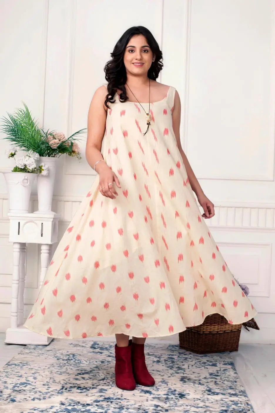 Fabric: Handwoven ikat cotton, ensuring a seamless blend with the dress.