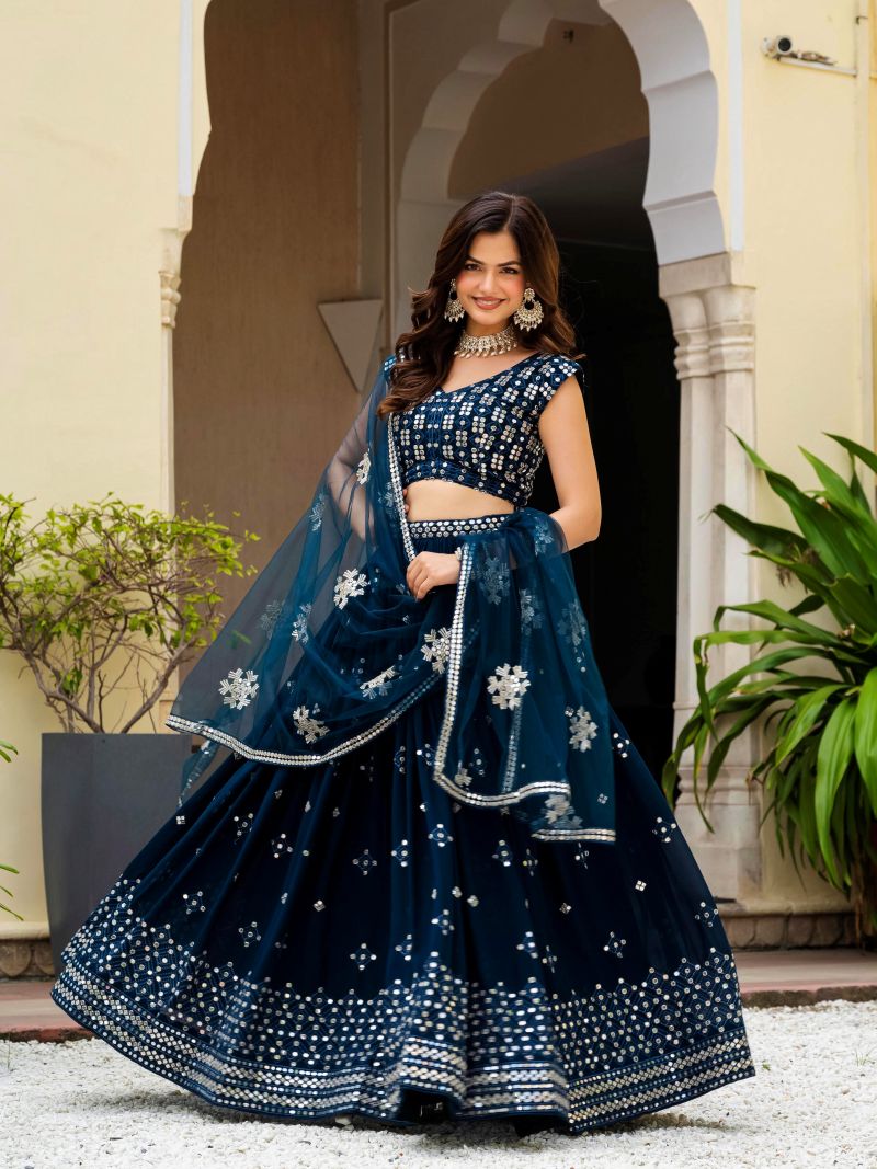 This stunning Teal Blue Georgette Lehenga Choli is perfect for weddings and special celebrations. It features rich zari and sequence embroidery that adds a luxurious and elegant touch. The semi-stitched A-line lehenga offers a beautiful fall and comfortable fit.